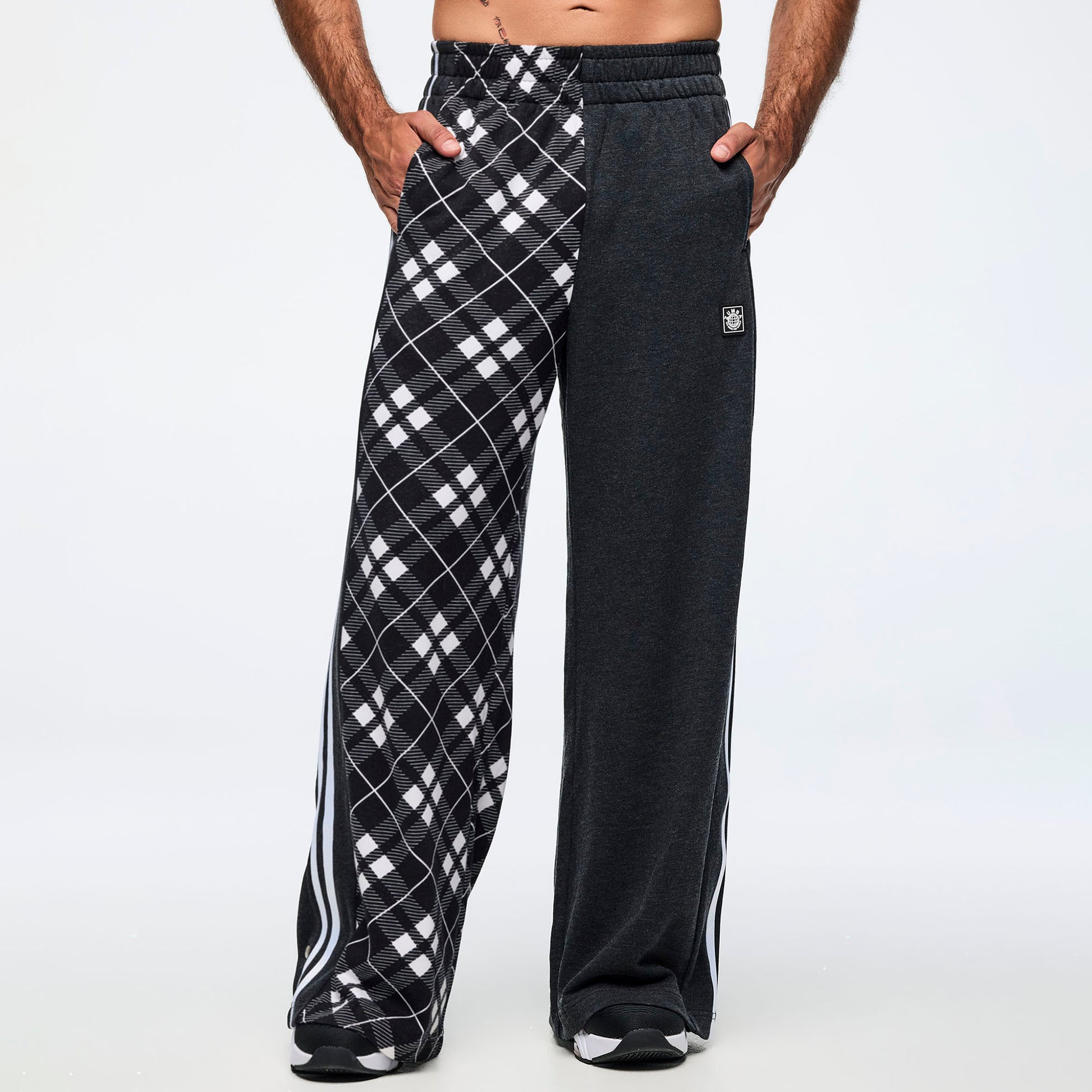 - Heather french terry on left leg, plaid printed french terry on right leg